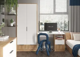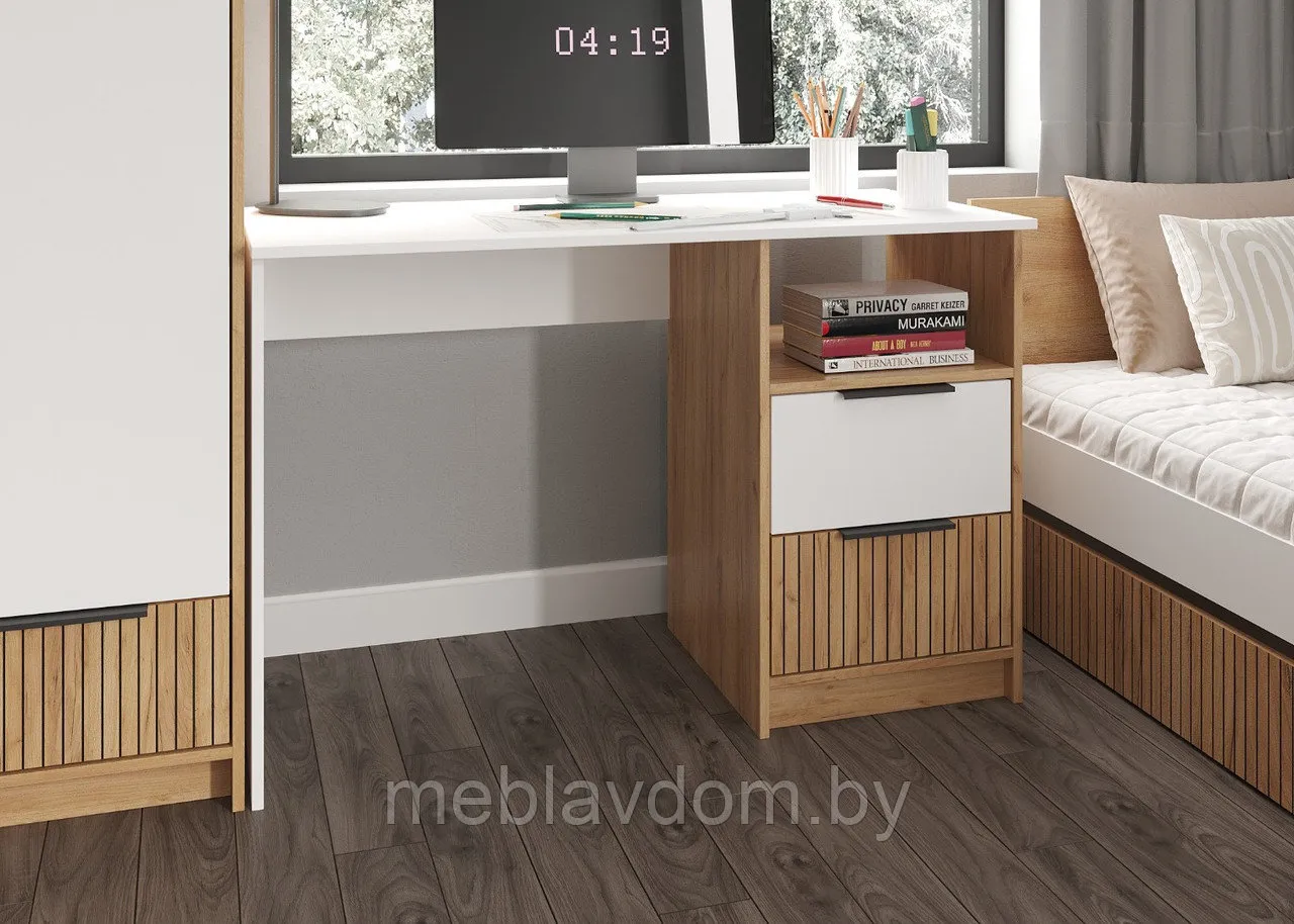 Стол письменный Ивис — это идеальное решение для гостиной, спальни или рабочего уголка. Его отличает широкая столешница, открытая полка и выдвижные ящики, оснащенные шариковыми направляющими, что обеспечивает удобство в использовании. Эффект фотопечати, имитирующей вертикальную фрезеровку на фасаде, в сочетании с черными ручками придает интерьеру уникальность. Цветовая гамма "Дуб Крафт золотой" и "Белый" помогает зрительно увеличить пространство и создает атмосферу тепла и комфорта.